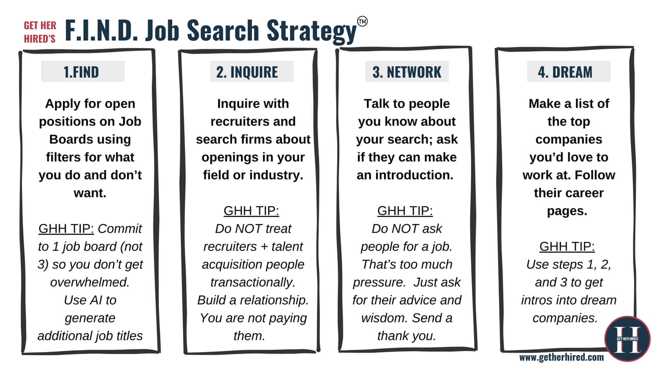 Do you want to land a job before the end of the year? Then try Get Her Hired’s 4-Step F.I.N.D Job Search Strategy. Many people apply to jobs like it’s 2001: they react to posts on job boards. Sweet friend - just applying does NOT even come close to cutting it anymore. Take action in EACH of these 4 areas 1-3x a week and I guarantee you will land more interviews, faster.