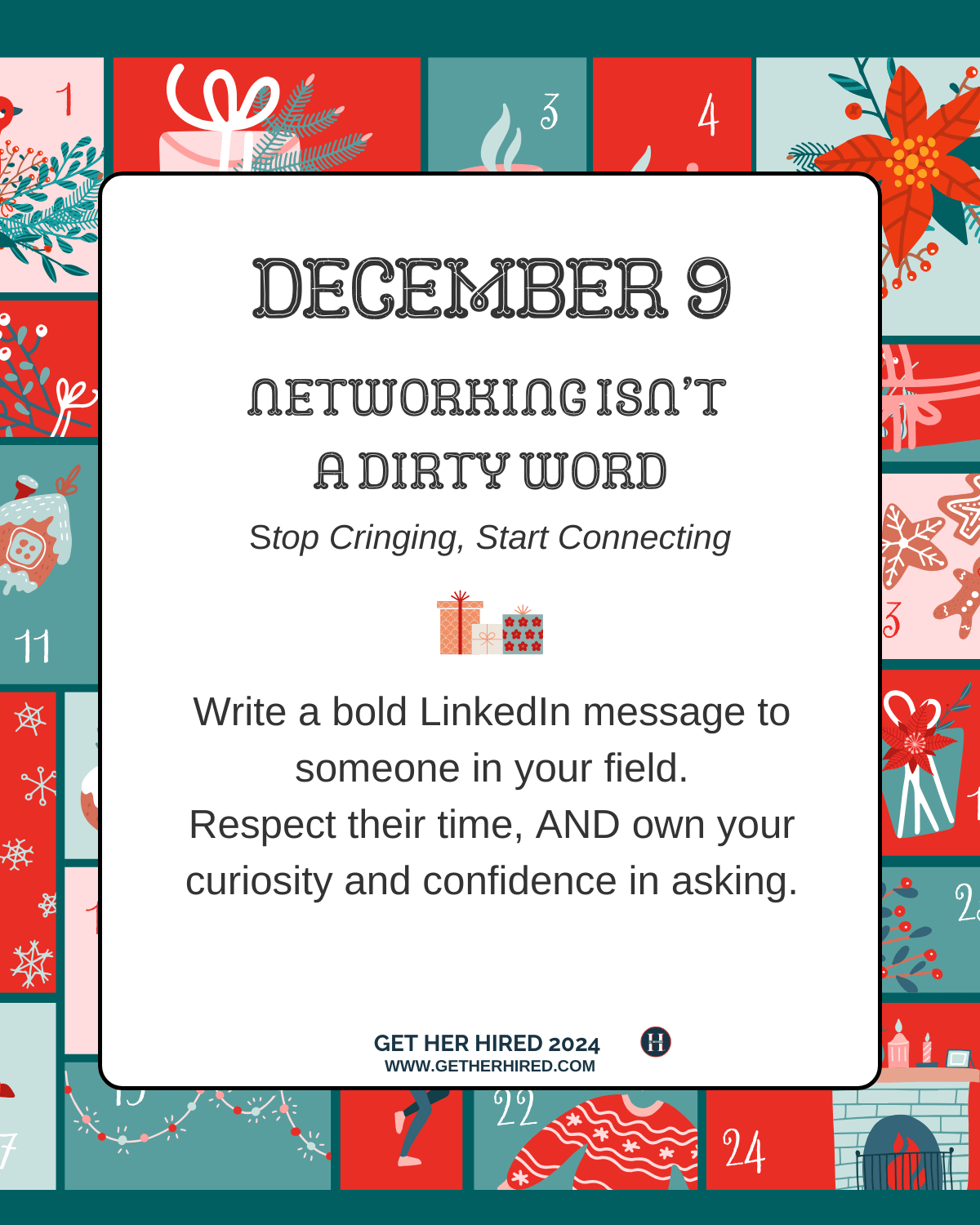 That’s where Get Her Hired’s 2024 Job-Search Advent Calendar comes in. Each day, I’m sharing bold, practical, actionable strategies designed to put the power back in YOUR hands. From defining your dream role to owning your narrative, these 24 days of advice are focused on the steps you can take to move your career forward—on your terms.
